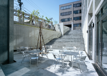 サンクンガーデンに面した憩いの空間。