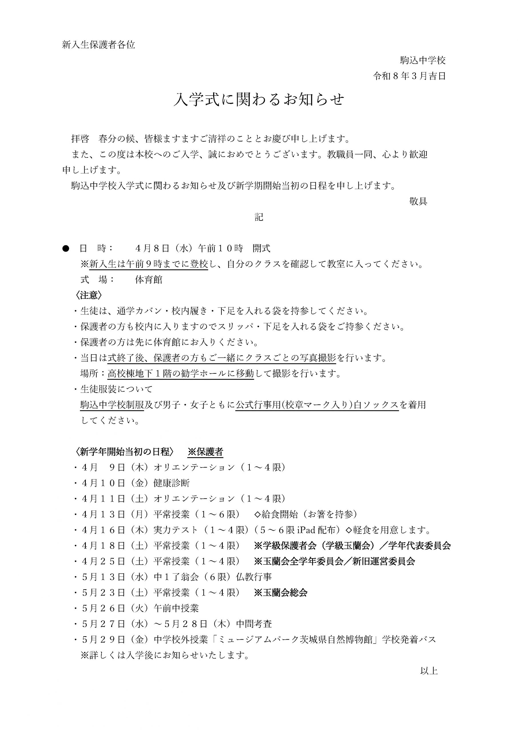 【重要】令和8年度中学校入学式に関わるお知らせ