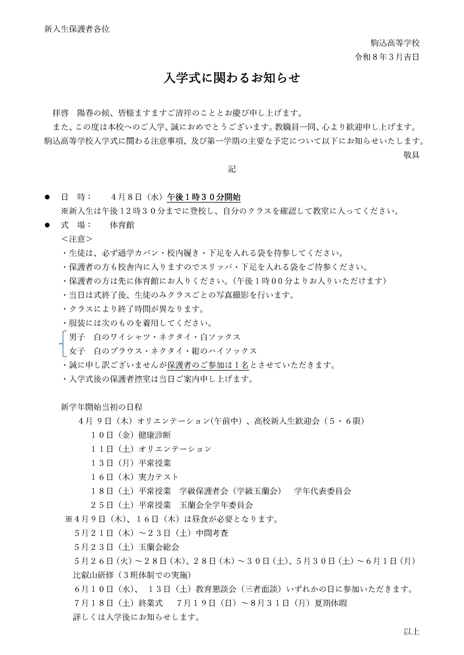 【重要】令和8年度高等学校入学式に関わるお知らせ